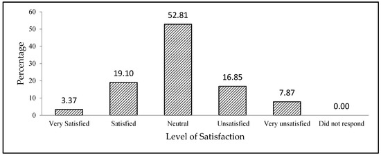 The results of the analysis of the recycling satisfaction score (RSS) showed that 56 (62.92%) of the respondents scored 0.65 or higher for recycling satisfaction (Figure 12). This result indicates that respondents were satisfied with the city’s current waste collection services and the size of the bin provided for curbside recycling. However, they were not satisfied with public engagement in the recycling planning process, since 69 respondents (70%) indicated their neutrality or low levels of dissatisfaction towards it (Figure 13). This data suggest that the city needs to engage more people in its town-hall meetings for planning to receive feedback and to implement what most of the people expect from the city’s recycling program.