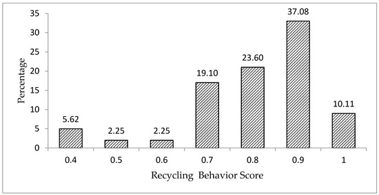 A recycling behavior score was determined to understand how frequently the respondents participated in recycling activities. This included their engagement in sorting recyclables at home and buying recycled materials from the market. To understand this issue, respondents were asked two questions: (a) How often do you recycle? (b) How often do you buy recycled products? The responses to these questions were quantified with a five-point Likert-scale: Every opportunity = 5, Weekly = 4, Monthly = 2, and Never = 1. A cumulative recycling satisfaction score for each respondent was calculated by adding up the ordinal values corresponding to their responses, and dividing it by the maximum value of 10. The results of 89 respondents ranged between 0.40 and 1.00 (Figure 14).