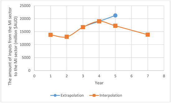 In this paper, we obtain two aggregated Australian IOTs for the 2010–2011 time period by interpolating and extrapolating from other aggregated Australian IOTs. The extrapolation uses base IOTs from 2006–2007, 2007–2008, 2008–2009, and 2009–2010 to create a 2010–2011 IOT while the interpolation uses the base IOTs from 2006 to 2009 and also the 2012–2013 IOT [18,19,20,21,22]. A comparative analysis of the forecasting accuracy between the interpolation and extrapolation shows that the result of interpolation is more reasonable.