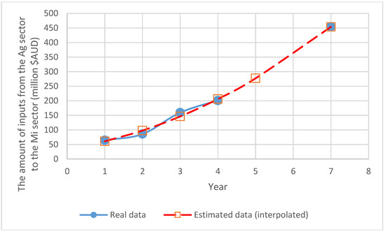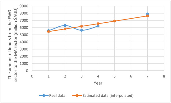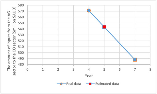 The curve fitting of the amount of inputs from the EWG sector to the MA sector in Figure 2 depicts the first type of regression results interpolated by applying the linear regression equation. Figure 3 shows the curve fitting of the amount of inputs from the AG sector to the MI sector interpolated by applying the quadratic polynomial equation. When the p-value is greater than , the inputs of IOA in 2010–2011 are estimated by those in 2009–2010 and 2012–2013. Figure 4 shows the linear regression curve of the amount of inputs from the AG sector to the CO sector when the second type of regression occurs. The regression models for inputs of AOI to intermediate sectors are shown in Table 3. The regression models of interpolating the Australian aggregation IOT of 2010–2011 are supplied from Table S6 to Table S13, which are available in the supplementary file. The regression models for extrapolating the Australian aggregation IOT of 2010–2011 are supplied from Table S14 to Table S22, available in the supplementary file. Ninety individual cells in the Australian IOT of 2010–2011 by interpolating and extrapolating are displayed in Table 4 and Table 5, in which 82 individual cells are interpolated and extrapolated by Equations (4) and (5). The values in the row of Other final demand (except two values from Primary input to Households and Other final demand) are estimated by subtracting the sum of inputs from intermediate sectors to Households and Other final demand from Total output to balance the IOTs of 2010–2011.