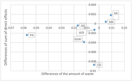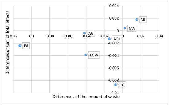 Figure 5 and Figure 6 show that an increase or decrease in the Australian economy has a direct impact on waste generation. For example, when the difference in the sum of direct or total inputs of intermediate sectors on the MI sector is positive, the difference of the amount of waste generated by the MI sector is also positive. The differences in the sum of direct or total inputs of intermediate sectors for the PA sector is negative, and the difference in the amount of waste directly or totally generated in the PA sector is also negative.