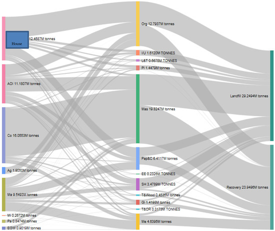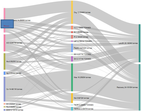 Figure 7 and Figure 8 depict physical flow of the waste footprint in the Australian economy in 2009–2010 and 2010–2011. From left to right, the figures show the amount of waste generated by intermediate sectors and the Households sector, the amount of 12 types of waste, and the amount of waste disposed by waste treatment methods. The amount of waste generated by intermediate sectors on the left-hand side are the sum of each column of while the amount of 12 types of waste in the middle are equal to the sum of each row of . The right-hand side are corresponding to the sum of , , and . For example, the major component of Org is generated by the Households sector, and almost 50% of Org is landfilled in 2009–2010.