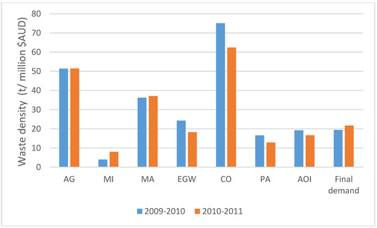 In addition, waste generation and treatment are linked to economic activity and environmental policies, and researchers need to recognize and identify the change of effects from economic activities and environmental policies on waste generation and treatment. Especially, more knowledge of comparative analysis based on two-year WIO models is needed. However, there is a limited time series of Australian waste data available, with the data available having many different grouping and accounting methods [15]. Only the waste data in the years 2009–2010 and 2010–2011 are appearing in a consistent format [4,17]. Moreover, while there is a 2009–2010 IOT, there is not a 2010–2011 IOT with which to harmonise the Australian waste data.