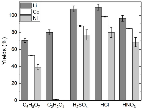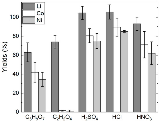 - Li, L.; Ge, J.; Wu, F.; Chen, R.; Chen, S.; Wu, B. Recovery of cobalt and lithium from spent lithium ion batteries using organic citric acid as leachant. J. Hazard Mater. 2010, 176, 288–293. [Google Scholar] [CrossRef] [PubMed]