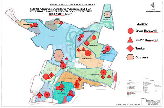 The study area, Bellandur, is the second-largest ward in Bengaluru, spanning an area of 26.4 sq km. This ward falls under the administrative jurisdiction of BBMP (Bruhat Bengaluru Mahangara Palike, Karnataka, India), which is a local body governing the peri-urban expansion of Bengaluru (Figure 1). The salient features of this ward are many in terms of administrative changes, water supply, and socio-economic characteristics. The Bellandur ward has 14 localities, of which 10 localities were under Gram Panchayath (Village Council) until 2005 and were then included under the urban local body after declaring some portion of this ward as a Special Economic Zone (SEZ). A map of the ward is shown in Figure 1. The SEZ development in four localities of this ward and its location formed a bridge or connectivity to two other major IT hubs (namely Whitefield and Electronic city), which paved the way for drastic development of residential and commercial establishments.