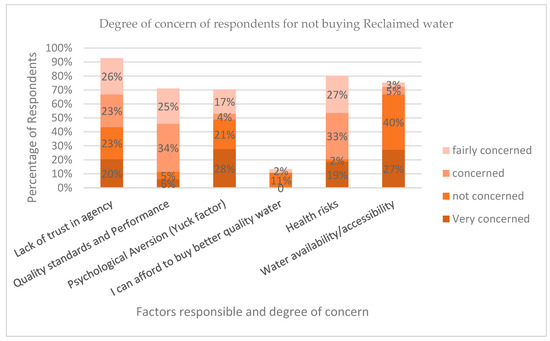 Eighty-nine percent of surface water-dependent communities are not aware of the concept of wastewater treatment or reuse. While interacting with this group, we briefed them about existing sewage treatment plants and how the sewerage board has been selling reclaimed water to industries and how they came up with a media advertisement to create awareness and sell the reclaimed water to other users. This advertisement was shown to respondents, asking if they were willing to accept and buy the reclaimed water at 15 INR per kiloliter. Sixty-seven percent of residents who were owners accepted (as shown in Table 8), and Figure 3 gives the reasons about what the respondents are concerned about and rejecting the use of treated wastewater. Twenty percent were very concerned about hygiene, and 33% respondents lacked trust in the agency regarding quality standards. The way in which treatment will be done, efficiency, and operation were concerns. The stakeholders opined that they are supplied with abundance of water supply either through borewells or surface water hence they do not want to pay for reclaimed water.