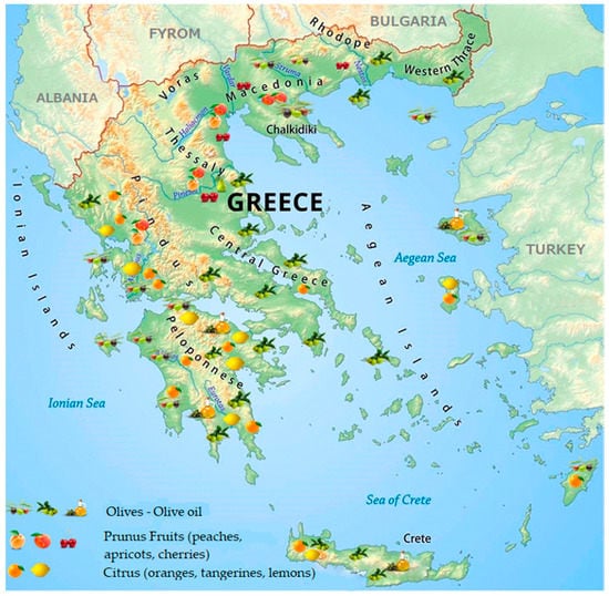 Fruits and vegetables constitute an important sector in the agricultural production of Greece holding very important share (about 39%) in the domestic agricultural economy, estimated at around 10 billion EUR [,]. Over the years 2009–2013, vegetables had the largest share of the total value of agricultural production (18%) followed by fruit production (16.6%) []. The major fruit production in Greece is derived from permanent tree crops (Cultivated areas of tree plantations and their production) and is comprised of olives (mainly oil producing), citrus (oranges, tangerines, lemons), stone fruits (peaches, apricots, cherries) and pome fruits (apples, pears) []. Greek table olives, oranges, peaches and apricots present high competitiveness in the global market [,]. Greece is among the top three EU producers of olives, peaches and citrus fruits [] and the leading EU peach processor []. Noticeably, the production of clingstone peaches that are exclusively used for industrial processing is among the biggest in the world.
