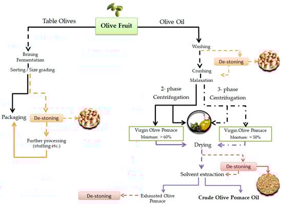 General processing lines for table olive, olive oil and olive pomace oil production with emphasis on the stages that generate olive stone and seed wastes [,].