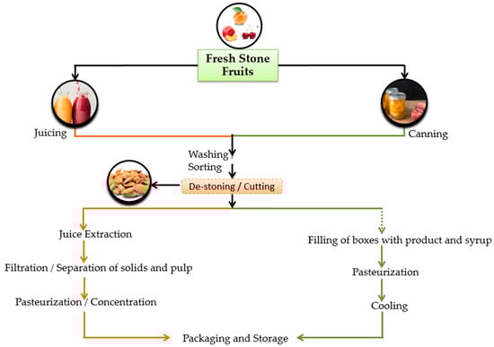 Fruits from the deciduous trees of the genus Prunus, such as Prunus persica (peach), P. armeniaca (apricot) and P. avium or P. cerasus (sweet and sour cherry, respectively) are also classified as drupes; they are often called stone fruits because the shell of the endocarp that encloses their kernels or seeds is hard like a stone []. Peach (including nectarine), apricot and sour cherry are the main types of stone fruits that are currently processed in Greece for the production of canned fruits (halves, dices and slices), fruit cocktails, and compotes but also for juices and puree concentrates []. Figure 4 shows the general schemes for processing fresh stone fruits in Greece. Regardless of the type of fruit or end-product, the removal of stones after washing and peeling of the fruits is a common procedure [].