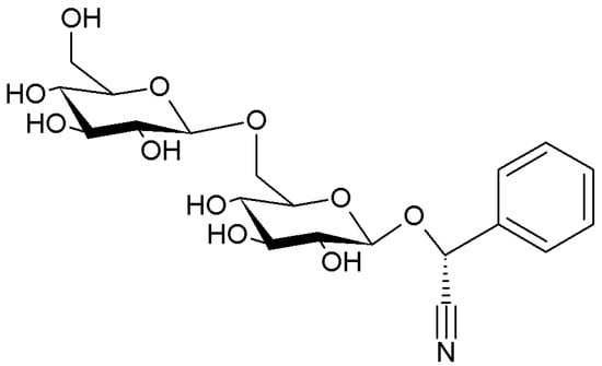 The stones of apricot and cherries represent almost 30% of the fruit weight while those of peaches are comparatively smaller (ca. 7% of the fruit weight). Irrespectively of the Prunus stone/fruit weight value, the enclosed seeds represent 6–7% of the total fruit weight []. Stones constitute the largest part (70–80%) of the solid waste from Prunus fruit canneries and juice processors. The remainder contains fruits unsuitable for processing, fruit peels, screenings, etc. in the form of sludge. Due to their high energy and low ash content values, the peach and apricot stones are often separated within the processing plant and used as solid fuel to reduce the cost of the production heat supply [,]. Alternatively, peeled stones of peach and apricot are sold in confectionery plants to be used to produce persipan, a substitute of marzipan. In that case, chemical treatment to remove toxic cyanogenic glycosides such as prunasin and amygdalin, is a prerequisite []. Amygdalin, accumulating mainly in the shell of the seeds [] is present at relatively high concentrations, reaching 3.89 mg/g in cherry, 6.81 mg/g in peach or even 14.37 mg/g in apricot seeds (see Figure 5) []. Generation of high levels of hydrogen cyanide through hydrolysis of these compounds in aqueous-alcoholic media is thus, an actual health risk []. The lethal dose of amygdalin which is estimated to 0.5–3.5 mg/kg body weight (bw), is likely to be exceeded by the consumption (grinding or chewing) of less than half of a large apricot seed [].