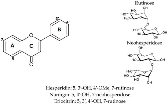 Phenolic compounds, also present in the citrus seeds are more probable to account for the antioxidant properties of their polar extracts. The composition and content level of individual phenolics and even synergistic phenomena are likely to affect the antioxidant potential of specific cultivars. The total phenolic content of mandarin seeds (C. reticulate Blanco cv. Chachiensis) was found to range from 2.3 to 3.0 mg GAE/g of dry sample []. The respective content in Tunisian mandarin and bitter orange seeds(C. reticulate Blanco and C. aurantium) harvested at three ripening stages (immature, semimature, and commercial mature) was found to vary from 0.68 to 2.11 mg GAE/g dry sample []. Moreover, lemon seeds were found richer than the corresponding fruit juice in total phenols (2.1–3.4 mg GAE/kg fresh weight). Interestingly, the total flavonoid content of the seeds was found to exceed more than 50-fold that of the juice []. Methanol extracts of citrus seeds are rich in flavones and glycosylated flavanones although the exact contents may fluctuate considerably according to a plethora of biotic and abiotic factors. For example, the seed content of glycosylated flavanones were found to range from 0.04 to 3.28 mg/g dry extract in different citrus cultivars []. However, total flavanones up to 47.4 mg/g dry extract have been reported in orange seeds recovered after industrial juice processing []. Hesperidin is the major flavanone found in sweet orange, naringin in bitter orange seeds and eriocitrin in lemon seeds (see Figure 7) [,,]. Hesperidin is the major flavanone in mandarin only until the semi mature stage; at the stage of fruit maturity the phenolic fraction of seeds is dominated by the presence of gallic acid. Altogether, the research findings indicate that citrus seeds may constitute a valuable source of phenolic antioxidants provided that the raw material is selected according to compositional data and standard requirements.