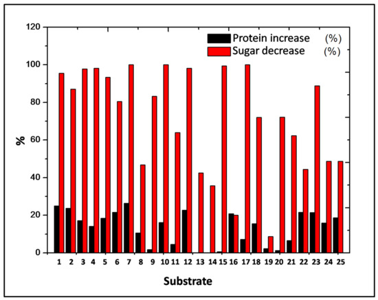Sugar consumption and protein increase during P. ostreatus growth in the 25 mixed AISS substrates.