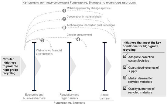 Figure 1 presents the conceptual model that visualizes the key drivers that help circumvent fundamental barriers and realize the key condition for high-grade recycling.