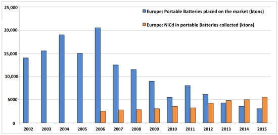 The authors of the ex-post evaluation of the Batteries Directive assume that 60.2% of NiCd batteries were collected. This information can be doubted, as there is no linear relationship between the mass of batteries placed on the market and the batteries collected, as can be seen in Figure 2 for Europe and Table 2 for Germany. Obviously, accumulators are far longer in use than just two or three years. Assuming a lifetime of about seven years for portable items [] and re-calculating the collection rates based on the first and the second column of Table 2, rates between 17% and 49% are obtained.