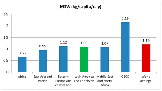 LAC is a region that is home to well over 600 million people [12]. MSW management statistics in LAC countries have some noticeable differences compared to other regions in the world. The generation of MSW in LAC is 1.09 kg/capita/day [1], which keeps LAC on par with the Eastern Europe and MENA region (Figure 1). This rate is much higher than that for Africa, but much lower compared to the members of the Organisation for Economic Co-operation and Development (OECD).