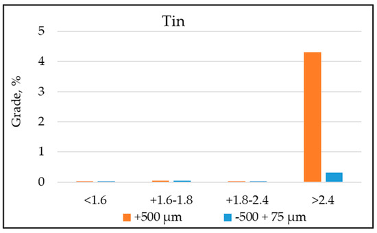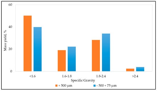 The float and sink tests were carried out at 1.6, 1.8, and 2.4 specific gravities, for +500 µm (coarse) and −500 + 75 µm (fine). The percentage yield for the products obtained from the float-sink test on coarse and fine samples are shown in Figure 1. The results showed that approximately 60–70% of the materials in the non-metal fractions are in the −1.8 SG, whereas a very small amount of the samples is present in the heaviest fraction (+2.4 SG), which suggests that most of the heavy metals were recovered during the beneficiation stage in the processing plant (‘+500’ represents material coarser than 500 µm whereas ‘−75’ represents material finer than 75 µm).
