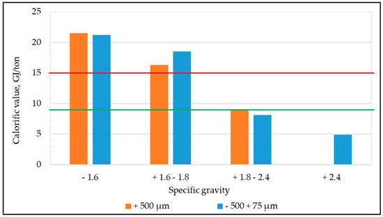 The calorific value of each density fraction was determined to estimate the energy value of different products. The results for the calorific values are shown in Figure 2. The red line represents the calorific value of the NMF as received, whereas the green line represents the calorific value of the shredded waste PCB prior to any separation. The heaviest fraction (+2.4 SG) of +500 µm was not tested, due to the presence of metal strands that could damage the analytical instrument. The results showed that the calorific value in the lower density fractions was increased to 21 GJ/t, compared to 15 GJ/t for the whole nonmetal fraction. This is most likely due to a higher concentration of the epoxy resins in the low-density fractions. Energy concentration in the higher density fraction decreased to below 10 GJ/t, due to the removal of most of the resin materials.