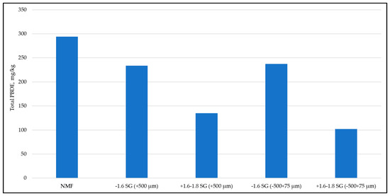 Figure 4 shows that the concentration of the total PBDE content in all the low-density product that will most likely be used for energy recovery purposes has decreased, compared to the NMF. The total concentration of the PBDE has been reduced by 20% for −1.6 SG fraction and by 55–65% for +1.6–1.8 SG fraction. Most of the flame retardants might be associated with the fiberglass and metals, and hence are found in the lower density fraction.