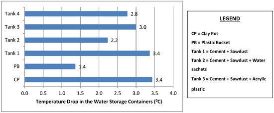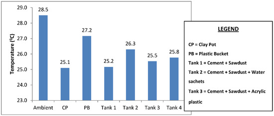 Figure 4. The samples stored in the plastic buckets had the highest mean temperature of 27.2 °C and a temperature drop of 1.4 °C, while samples stored in the clay pots had the lowest mean temperature of 25.1 °C and a temperature drop of 3.4 °C. The cooling effects of the cement-bonded containers were in the following order: cement-sawdust tank > cement-sawdust-acrylic plastic waste tank > cement-sawdust-water sachet-acrylic plastic waste tank > cement-sawdust-water sachet tank. As shown in