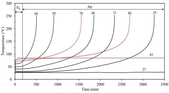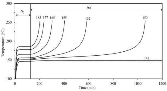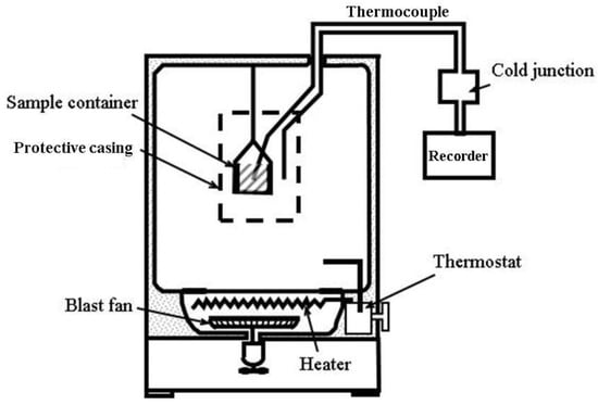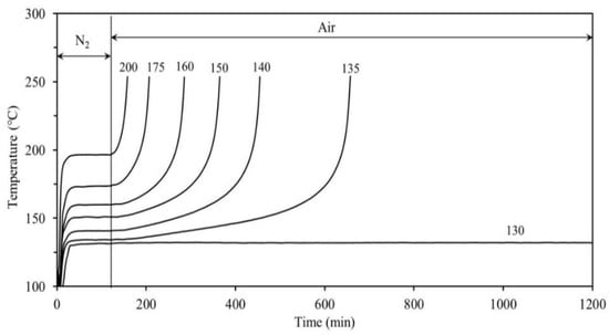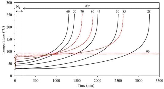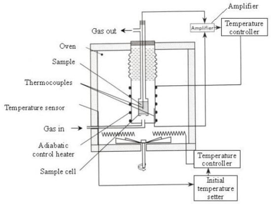 To consider the transition from self-heating to spontaneous ignition, a more advanced detector is required. We used a spontaneous ignition tester (SIT) (Shimadzu SIT-2, Kyoto, Japan) to test for materials that are susceptible to spontaneous ignition under adiabatic conditions [11], in which heat loss to the surroundings is minimised, and the heat liberated from exothermic reactions is used in the self-heating process. Figure 3 shows a schematic diagram of the device. After setting the oven temperature of the tester, each sample (~1.5 g) was placed in the oven under a 5 mL/min flow of nitrogen to prevent the sample from reacting. Air, at a rate of 2 mL/min, was then introduced, and the temperature was recorded. If no temperature increase was observed after 120 h at the set temperature, the test was considered to be complete.