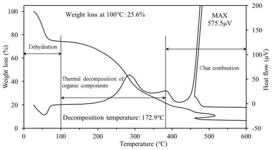 Figure 6 and Figure 7 display TG-DTA traces for SSSR and fishmeal, respectively, recorded at a scan rate of 2 °C/min. The decomposition temperatures correspond to the points at which the DTA traces shift by 0.1 μV (0.01 °C) in the heat-generation direction from the constant baseline.