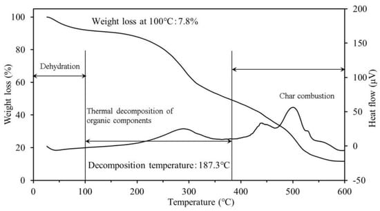 The downward direction in the DTA trace indicates an endothermic reaction, while the upward direction corresponds to an exothermic reaction. The thermal decompositions of SSSR and fishmeal are divided into three phases. Due to dehydration, a total weight decrease of 26% was observed from room temperature to 100 °C for SSSR, after which organic components decomposed and combusted over the 180 °C to 380 °C range [13,14]. By the end of this phase, a total weight loss of about 70% was observed. The final stage is consistent with the decomposition and combustion of carbide, to leave a residue that weighed only 10% of the original sample weight.