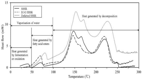We attribute the heat generated in the 50–100 °C range to the oxidation of residual fat that could not be defatted under the present conditions, and to the oxidation of other components [16]. The heat generated through the oxidation of fatty acid esters was observed over the 80–100 °C temperature range for all of the samples. Above 100 °C, the observed generation of heat is assumed to be caused by decomposition [13,14].