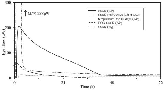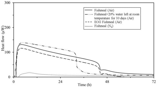However, this phenomenon was immediately followed by a converging trend ascribed to microbial proliferation resulting from the addition of water to the sample. Hence, the oxygen in the sealed sample vessel was consumed during the early stages of the experiment. Examination of the results of the experiments conducted under nitrogen, and those following EOG treatment, led to the following conclusions: fermentation has a greater effect in SSSR, whereas oxidation has a greater effect in fishmeal, with respect to the heat generated near 50 °C. This observation is consistent with the C80-calorimetry results.
