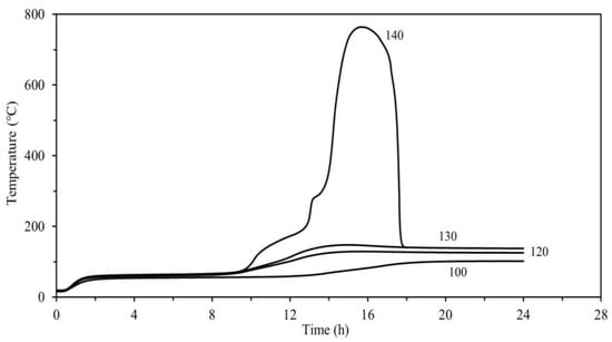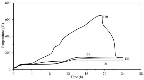 The C80 and TAM-calorimetry results strongly suggest that SSSR and fishmeal generate heat through fermentation and oxidation at approximately 50 °C. To examine whether or not the accumulation of generated heat results in an increase in temperature that eventually causes fire, we used a SIT that is capable of reproducing the adiabatic conditions of high-volume storage [11]. Figure 12 and Figure 13 display SIT curves for SSSR and fishmeal, respectively, at various environmental temperatures between room temperature and 100 °C, while Figure 14 and Figure 15 show the analogous curves for initial temperatures between 100–200 °C. A flat SIT curve is observed when no heat is generated from the sample, but a rise in sample temperature is observed as the sample begins to generate heat.