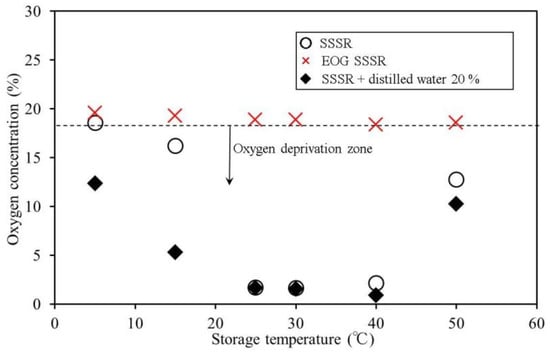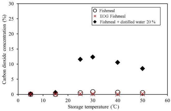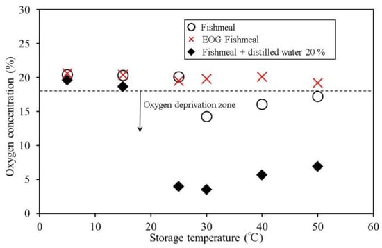 A significant reduction in the amount of generated CO2 was observed in the EOG-treated sample, and no H2, CO, or CH4 was observed. In the case of SSSR, we found that the concentration of oxygen can drop to below critical levels that adversely affect human health, even when stored below 25 °C, especially in samples with high moisture contents. For fishmeal stored below 25 °C, the concentration of oxygen did not decrease to critical levels; however, some sudden drops were observed in fishmeal stored above 25 °C.