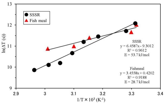 The data obtained from the SIT experiments were used to calculate activation energies. During the induction period, the temperature increases extremely slowly and in a linear manner over a long time. Since the temperature increases only slightly, and assuming that the heat-generation reaction can be approximated by a zero-order adiabatic process [21], the following equation (Equation (1)) can be established under adiabatic conditions at environmental temperature, T [3].