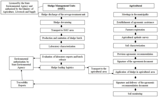 The SMU requests an operating license from the State Environmental Agency and the authorization of the Ministry of Agriculture, Livestock and Supply (MAPA) for commercialization of sewage sludge for agricultural and forestry use, in accordance with Decree 4954 [10,11]. It is possible to visualize, in Figure 2, the operational sequence of the agricultural use of sewage sludge process, which included activities in two spheres of action: one in the context of the SMU and another in the agricultural sphere.