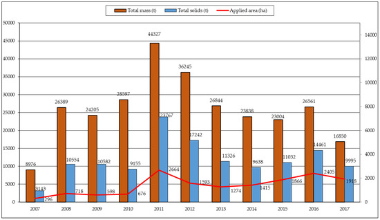 From 2007 to 2017, 285,836 t of sewage sludge, sanitized by PAS (130,895 t dry matter), were applied in 15,423 ha of agricultural areas of Paraná State; the average application rate was 8.5 t·ha−1 (dry matter). Figure 3 shows the data of agricultural destination of sewage sludge sanitized by PAS from 2007 to 2017 in Paraná, Brazil.