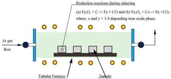 Phases of iron oxide in scrap were determined quantitatively to calculate the quantity of (carbonaceous) reducing agents required for carbothermic reduction during sintering. A calculated amount of reducing agent (here carbonaceous material) is mixed with iron oxide powder for in-situ carbothermic reduction during sintering. Mixing was performed using a mixer grinder mixing, turbula mixing, and low-energy ball milling, as well as a combination of these. The powder mixture was uniaxially compacted using either a hydraulic press or a mechanical press, which enabled compaction at different strain rates. Compaction of powder mixture to different sample shapes such as a solid cylinder and cylindrical bushes of various dimensions was also performed using dies designed and manufactured for the purpose. Compacted samples were then heated to have in-situ reduction and densification during the PM sintering cycle. A laboratory scale tubular furnace with inert gas flow arrangement as well as vacuum was utilized [10]. A series of reduction reactions took place during the initial phase of sintering, as represented schematically in Figure 1.