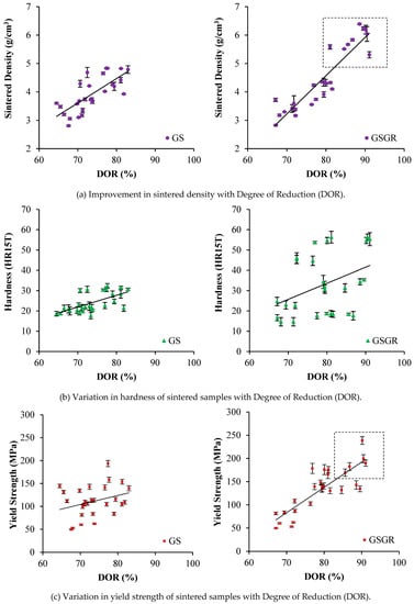 Sintered density, hardness, and yield strength show an increasing trend with DOR. The reason is the characteristics (properties and DOR) are simultaneously influenced by in-situ reduction and setting of control parameters. Sintered densities of GS and GSGR samples were similar for 65% to 80% DOR (Figure 2a). However, sintered density of GSGR samples further improved from 5.5 to 6.5 g/cm3 with an increase in DOR facilitated by 25% excess (compared to stoichiometry) carbon, compaction pressure (1050 MPa), sintering temperature (1200–1300 °C), and argon gas atmosphere in sintering. Hardness measured on the surface of cylindrical sintered samples does not correlate well with DOR (which is a bulk characteristic) [21]. The yield strength of sintered samples also correlated well with DOR because the increase in the metallic transformation resulting from reduction and densification enable a proportional increase in yield strength of the GSGR samples.