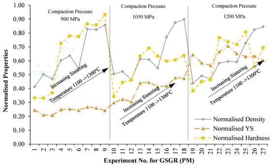 Variation in normalized properties of GSGR (PM) sintered samples with experimental condition (parametric setting corresponding to the Exp. No. is given in Table A1).