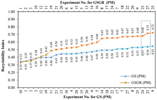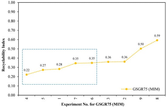 Furthermore, these individual normalized properties were averaged and represented as a Recyclability Index (see relation 6) corresponding to the experimental setting for GGSR75 samples. These averaged numbers (Recyclability Index) quantify the overall normalized property of sintered samples for a given experimental setting (Exp. No. 1–9 from Appendix B). This Recyclability Index is useful for comparison between the overall structural strength of GSGR75 and CI90 with equivalent energy input for MIM processing. Recyclability Index is arranged in ascending order with corresponding experiment number for GSGR75 and given in Figure 6.