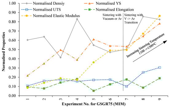 Variation in normalized properties of GSGR75 (MIM) sintered samples with experimental condition.