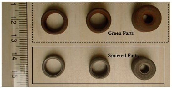The first step of MIM process is to create a feedstock (a mixture) of metal powder, a reducing agent as before, and a polymer. The metal powder was mixed with a thermoplastic binder, cooled, and then granulated into a homogeneous feedstock in the form of pellets. Usually, sigma blade mixer was used to prepare the feedstock, which typically had 60% metal and 40% polymer by volume. The feedstock was shaped using the equipment and tooling similar to what is used in plastic injection molding. However, the mold cavities have to be designed approximately 20% larger to account for the shrinkage of the moulded product during sintering. During the molding cycle, the feedstock is melted and injected into the mold cavity, where it cools and solidifies into the shape of the part. The molded “green” part is ejected. In the subsequent step, polymer binders are removed from the solidified moulded shape. In some cases, solvent debinding is first performed in which the “green” part is placed in water or chemical bath (depending on the solubility of the binder) to dissolve the sacrificial binder component. The solvent debinded part is heated at a gentle heating rate in a low-temperature oven to remove the residual solvent left behind in the pores. After this step, thermal debinding or pre-sintering is performed in vacuum to remove the polymer binder by evaporation. As a result, the remaining “brown” metal part contains approximately 40% voids by volume. The final step of sintering is required to consolidate the loosely bound powder in the “brown” part, resulting in a high-density (95–99%) metal part. Sintering is usually carried out in an inert gas atmosphere or in the vacuum. Sintering temperatures are usually close to 85% of the metal’s melting point [11,12].