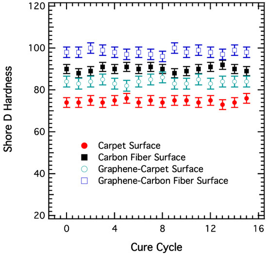The fabricated recycled carpet has two surfaces—carbon fiber on one side and polypropylene lining on the other side. The Shore D hardness values of the tooling surface are measured for both the surfaces for each cure cycle of 15 total cure cycles. The results of the hardness data plotted as the function of the number of cure cycles are shown in Figure 3. It was observed that the tooling surface demonstrated no change in the surface hardness with the increase of cure cycles, indicating that the composite maintains its strength and hardness after exposure to each cure cycle. The carbon fiber surface shows higher hardness values compared to the polypropylene surface. The increase in hardness is expected due to more cross-linking of polymers with the subsequent curing cycle. The inclusion of the stiffening graphene filler in the composite increased the surface hardness value.