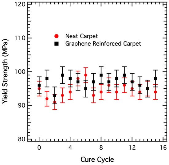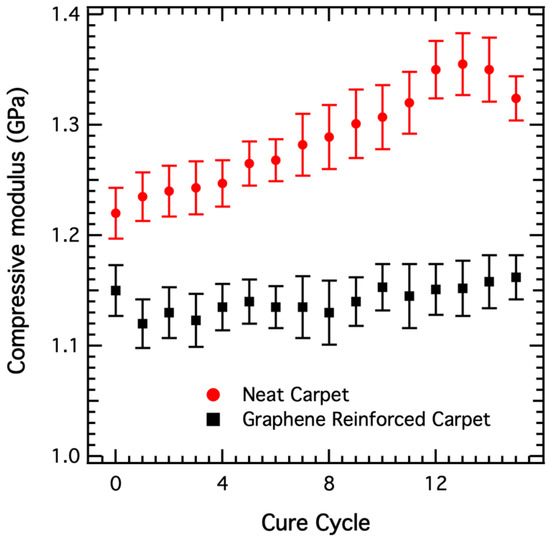Compressive modulus results as shown in Figure 4 show that it initially increases with the increase in the curing cycles and eventually gets stabilized at higher curing cycles. The increase in the compressive modulus is attributed to the increase in the cross-link density with the increase in curing cycles. At higher curing cycles, the epoxy is cross-linked, hence the elastic modulus value is saturated around 1350 MPa. Interestingly, the presence of nanofiller decreases the compressive modulus value compared to neat carpet composite. This decrease in the compressive modulus value may be due to the presence of the graphene nanofiller, which interferes with the chemical crosslinking of the epoxy resin. However, as shown in Figure 5, the yield strength does not exhibit any change with the increase of curing cycles as well as by reinforcement of the graphene nanofiller.