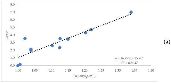 It is observed that the organic carbon content has a strong influence on the final density of the concentrate obtained. Thus, some statistical analysis can now be used to verify the correlation between bulk density and TOC for sample from October 2017 and June 2018, as shown in Figure 1a,b that presents how density is affected by the TOC in each sample.
