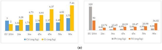 As shown in Figure 2a,b, the content of Pb fulfills the requirements of the EU legislation in all concentrated samples produced. However, Cd, Cr and Ni must be removed to achieve the fertilizer requirements.