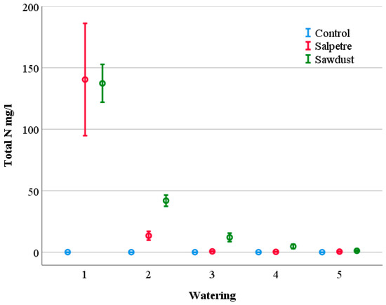 Concentration of total nitrogen (NH4-N + NO2-N + NO3-N, mg L−1) in water collected on five occasions below funnels on top of which salpetre or ammonium sulphate absorbed to sawdust were positioned. Funnels with no fertilizers functioned as control treatment. The values are mean (±1 SE) of three replicates (SE = Standard error).