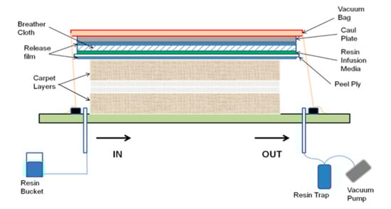 The vacuum-assisted resin transfer molding (VARTM) process was used to fabricate carpet composites, as shown in Figure 2. In this process, layers of carpet were placed on a metal mold which was completely sealed inside a vacuum bag with an inlet and outlet port for the resin to flow through the carpet layers. A vacuum pressure of 75 kPa was utilized to pull the resin and infuse inside the carpet layer.