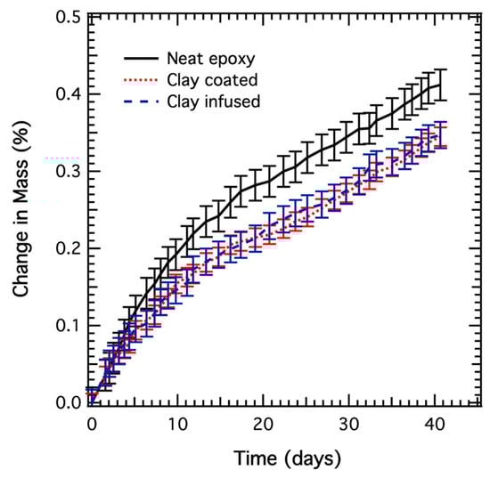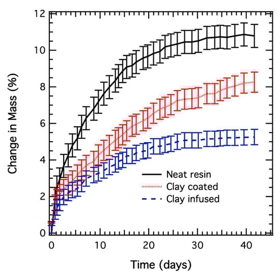 Interestingly, composites prepared by clay coating initially show the rate of increase in mass similar to the neat resin, however, with an increase in time, the rate of change in mass decreases for the clay-coated composites. This decrease in the moisture absorption rate with an increase in exposure time is because the saturation on the surface is reached more quickly for clay-coated composite than neat resin composite. After saturation is reached on the surface, the clay restricts further moisture absorption.