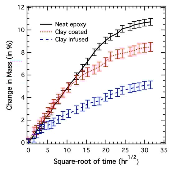 The change in the mass of the carpet composites due to moisture absorption as a function of the square root of time is shown in Figure 5. In the plot, the initial straight line indicates one directional Fickian diffusion, which suggests that the movement of the moisture molecule is through micropores only [30,31]. The composite prepared by only neat resin shows the highest increase in the mass with time as compared with the clay-coated and clay-infused composites. This increase in the mass for the neat resin is due to the higher moisture absorption, as shown in Figure 4. The mass change for the composite prepared by clay infusion is less as compared with neat resin and clay-coated composites. The result indicates that the barrier properties of clay in the resin restrict the absorption of moisture in the composites.