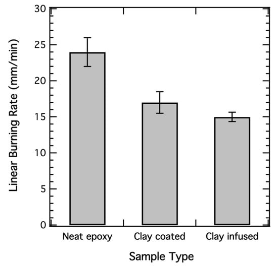 Linear burning rate of neat and clay carpet composites. The error bar shows ± standard deviation of eleven specimens.
