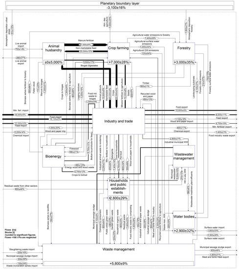 Nitrogen (N) and phosphorus (P) are essential nutrients for all living organisms, and therefore the socioeconomic P-N system predominately revolves around the fertilizer and food industries. Unlike most other resources, the majority of N is found in the atmosphere, which is why mining activities are usually negligible. On the other hand, exchanges with natural compartments play an important role in the N system because N takes up multiple chemical forms as it circles through air, water, and terrestrial ecosystems, some of which act as pollutants and/or greenhouse gases [53]. Phosphate rock minerals are the only significant virgin P supply. However, as Austria, like Europe in general (except for Finland), does not dispose of any resources, it has to rely on imports. The declining quality of the mined material and volatile prices have spurred discussion on P scarcity, but excess discharge of P to water bodies and subsequent eutrophication are also looked at with concern [54]. Nonetheless, P- and N-rich flows, such as manure, show high potentials for recovery of energy, water, and biofertilizer, and therefore can be considered as technological nutrients [55].