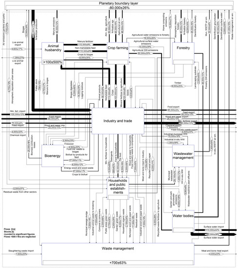 Results of the transformation of the three case studies described in Section 2 into the generic system can be found in Figure 7. A full inventory of subsystems is provided in Appendix A. The schemes depicted in Figure 7 already reveal some of the particularities and management problems of a specific material or setting. For instance, the biomass dominated P-N system is characterized by high exchanges and the environment and recycling seems to play an even larger role than for Cu, which is considered one of the most recycled metals [58]. On the other hand, production appears not to be very efficient as only a small part of input P/N ends up in F05 (domestic consumption). The system boundary in Figure 7d is the Karlskoga plant, thus all electricity, heat, and steam produced leave the system as export, and the use sector is virtually inexistent. According to Karlsson et al. [57], part of the electricity produced is used to power company-owned vehicles, and therefore could be regarded as end-use consumption. However, as no further information on the magnitude and nature of this flow is given, it was neglected in the current study.